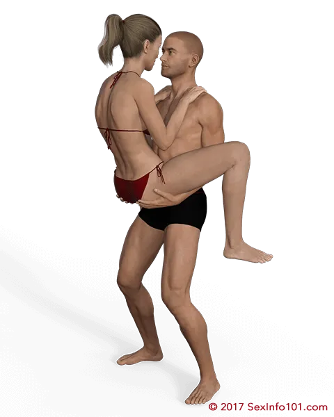 Men have the option of holding their partner as illustrated, or alternatively, they can wrap their arms around the outside of the woman's body. Women might want to have at least one of their arms wrapped around the man's neck to make sure they don't slip backwards... unless of course you want to do that on purpose.
