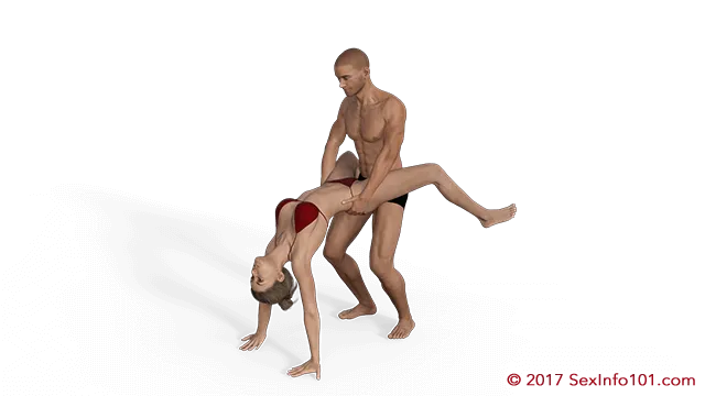 In the Lazy variation of the Hanger, the woman's legs hang loosely around the man's hips. This tends to have a counter-balancing effect for women, though it can be a little trickier for men to keep a good grip. We recommend for the man to bend his knees as much as he can comfortably, so that the woman can rest as much of her lower body weight on the man's thighs, and reduce the strain on his upper body.