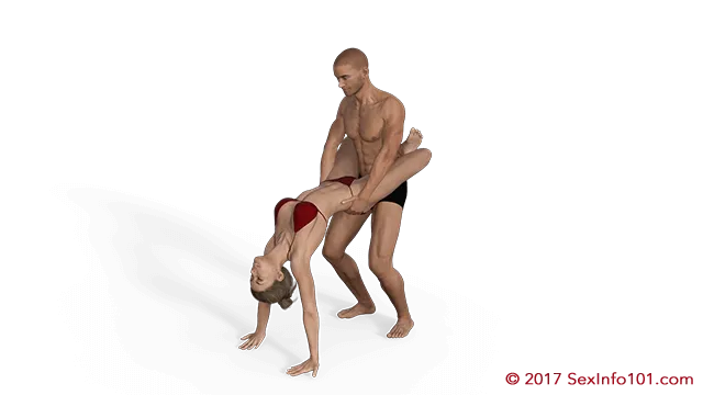 One of the safest forms of the Hanger, and we mean that relatively speaking, the Wrapped variation is likely the best place for most couples to begin with this family. Having her legs wrapped around the man has a lot of benefits; it increases skin contact, takes a lot of the load off, provides stability, and allows the woman to help guide the pace and depth by squeezing her legs. As in the Lazy variation, we recommend to use the man's upper thighs to rest the woman's legs against to reduce the upper body strain as much as possible.