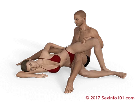 In the Seated variation of Scissors, the man sits on the ground while the woman lies on her side. This offers a different form of limited mobility over the standard variation, which can be improved by the man planting his hands and lifting his rear off the ground so that he can add a little swing. We recommend for women to experiment with using their planted foot to help increase the distance of each stroke, and a pillow under the man's rear can help align you for max depth while improving mobility.